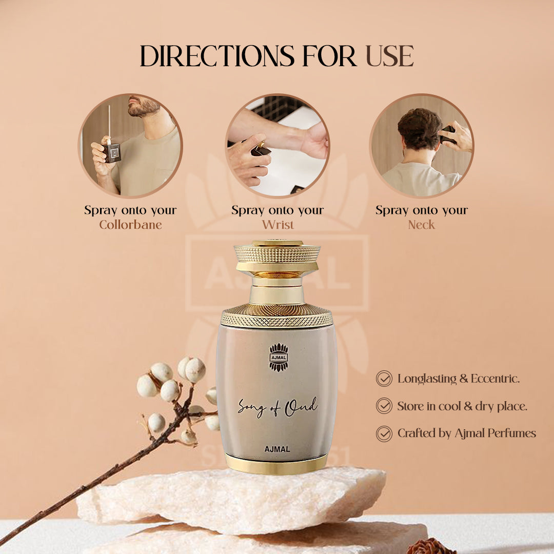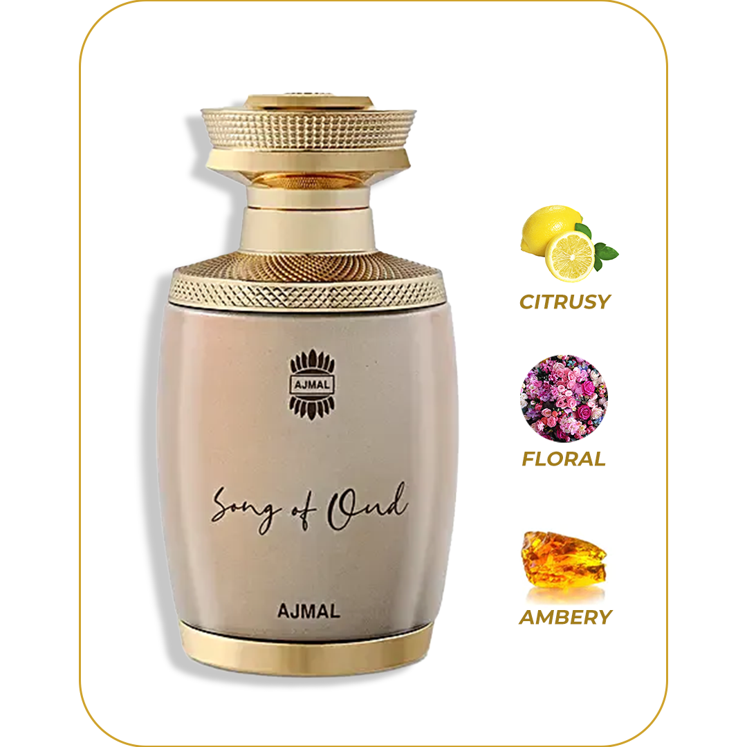A fragrant melody that flows... Song of Oud is a classic scent that combines the present with the past. Bergamot, apple, and ginger are on top of a citrusy, fruity, and spicy flavor. Floral at its heart, comprising of lily of the valley, jasmine, and orris. And at the base, Ambery, Musky and Woody with amber, musk, and patchouli.