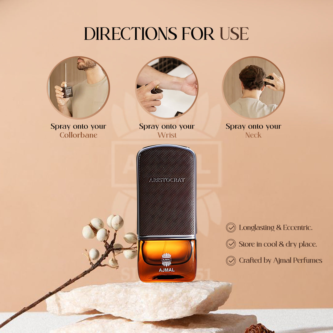 Aristocrat Cologne Perfume by Ajmal is a Woody Floral Musk fragrance for Men. A luxury perfume that shows modesty and sophistication. With a lasting and provocative stamp, it symbolizes decadent luxury. It is bottled into a stylish looking container to show the nature of the magnificent perfume.