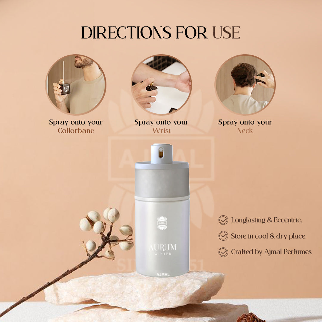 Aurum Winter for Women by Ajmal Perfume, a spritz of this beautifully balanced fragrance that captures the spirit of youth, self-indulgence, and glamour, will allure your senses with its marvelously captivating.