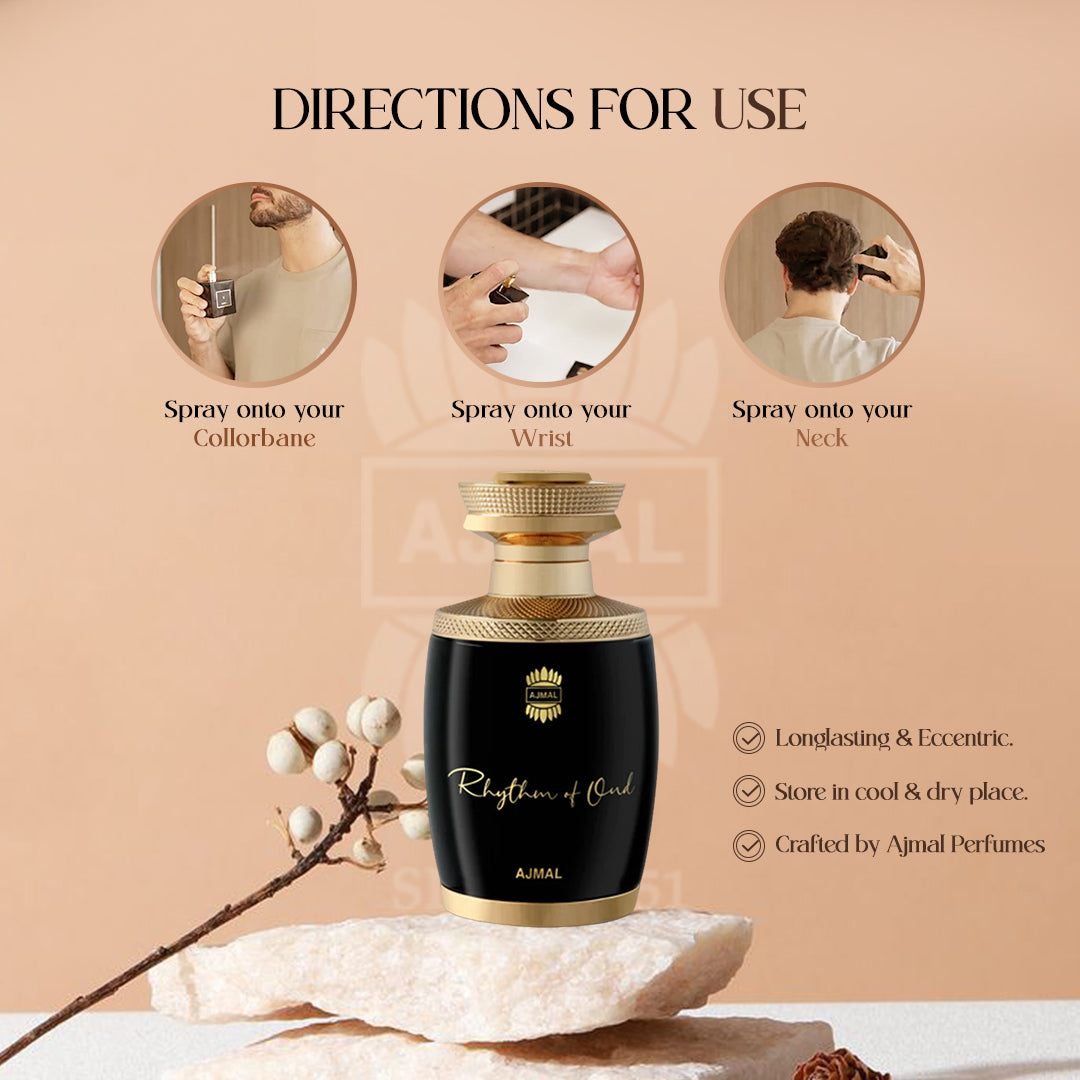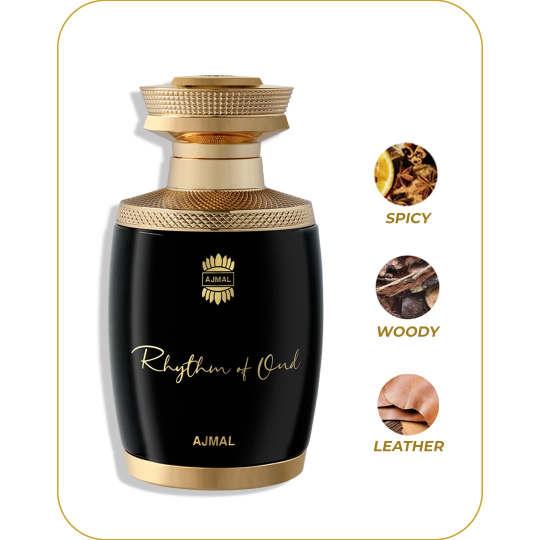 Rhythm Of Oud by Ajmal Perfumes is an amazing fragrance that synchronizes with your olfactory senses like music. A spicy topping is made with saffron, cardamom, and nutmeg. Osmanthus, cedarwood, and patchouli combine to create a woody, fruity heart. And a Leathery Musky base with leather accord and musk.