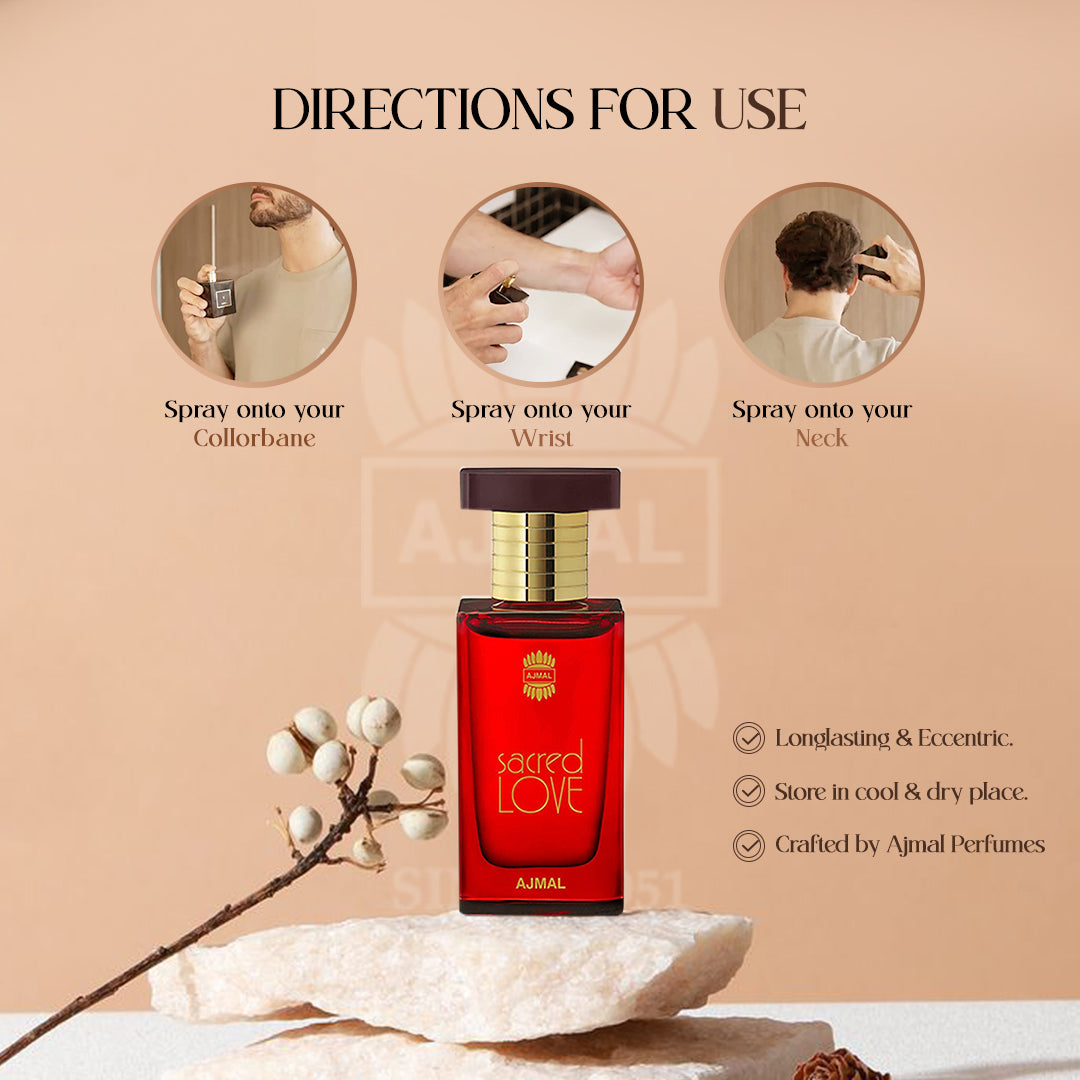 Sacred Love CPO by Ajmal Perfume is a sweet fragrance that warms up the heart of a woman with feelings of romance. The scent immediately invigorates the wearer from the start with a citrusy opening that’s full of joy, then embraces her with the warmth of its floral-musky heart. The rich depth of the floral base amplifies these sensations and lets the wearer share them with those around her for hours to come.