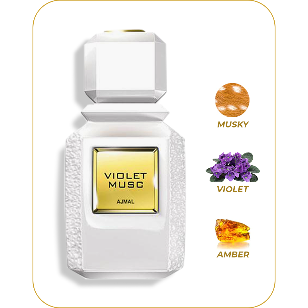 Violet Musc by Ajmal Perfume is an oriental floral fragrance that has a blend of lily-of-the-valley, ylang-ylang, rose, musk, violet, and amber. The heart blooms with intense violet resting on warm aromas of amber and musk. It's recommended for casual wear.